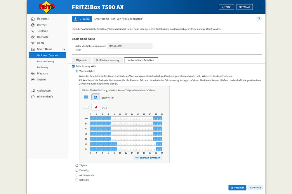 Die Rollläden lassen sich so einstellen, dass diese zu bestimmten Zeiten immer das passende Licht durch die Fenster lassen. Über die „Automatische Schaltung“ in der Benutzeroberfläche deiner FRITZ!Box können die Rollläden in festgelegten Zeiten automatisch hoch- und heruntergefahren werden. Lass so morgens die Sonnenstrahlen ins Schlafzimmer, wenn du aufstehst. Die flexible Steuerung hilft auch bei der Hitzeregulierung, indem du zur Mittagssonne die Räume abdunkelst, damit sich diese nicht zu sehr aufheizen.