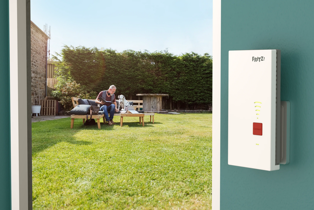 Um die WLAN-Reichweite bis in den Garten zu erhöhen empfiehlt es sich, noch im Haus einen FRITZ!Repeater in unmittelbarer Gartennähe aufzustellen, beispielsweise auf der Fensterbank oder einem Regal neben der Tür zum Garten. Der FRITZ!Repeater 6000 eignet sich zu diesem Zweck besonders gut, da er nicht direkt in die Steckdose gesteckt wird, sondern dank des mitgelieferten Netzkabels relativ frei aufgestellt werden kann.