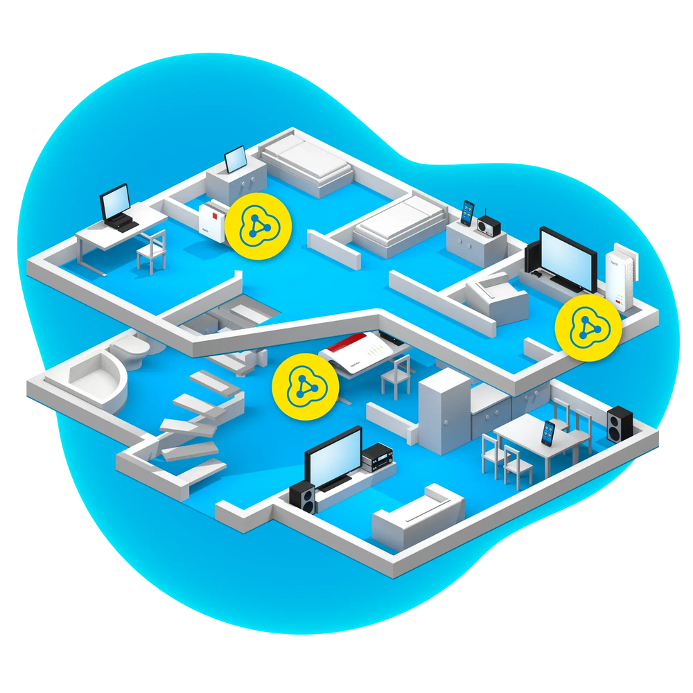 Vergrößere dein Heimnetz mit FRITZ! Mesh. Ganz gleich, ob große Wohnung, mehrgeschössiges Einfamilienhaus oder Garten - Mesh mit FRITZ! bringt schnelles und stabiles WLAN in jeden Winkel deines Zuhauses. Ergänze dein Heimnetz einfach um weitere FRITZ!-Produkte, die von deinem Mesh Master (z.B. FRITZ!Box) zu einem großen WLAN "verwebt" werden. Mesh mit FRITZ! stellt sicher, dass deine Geräte immer und überall optimalen Zugang zum Internet und Heimnetz erhalten.