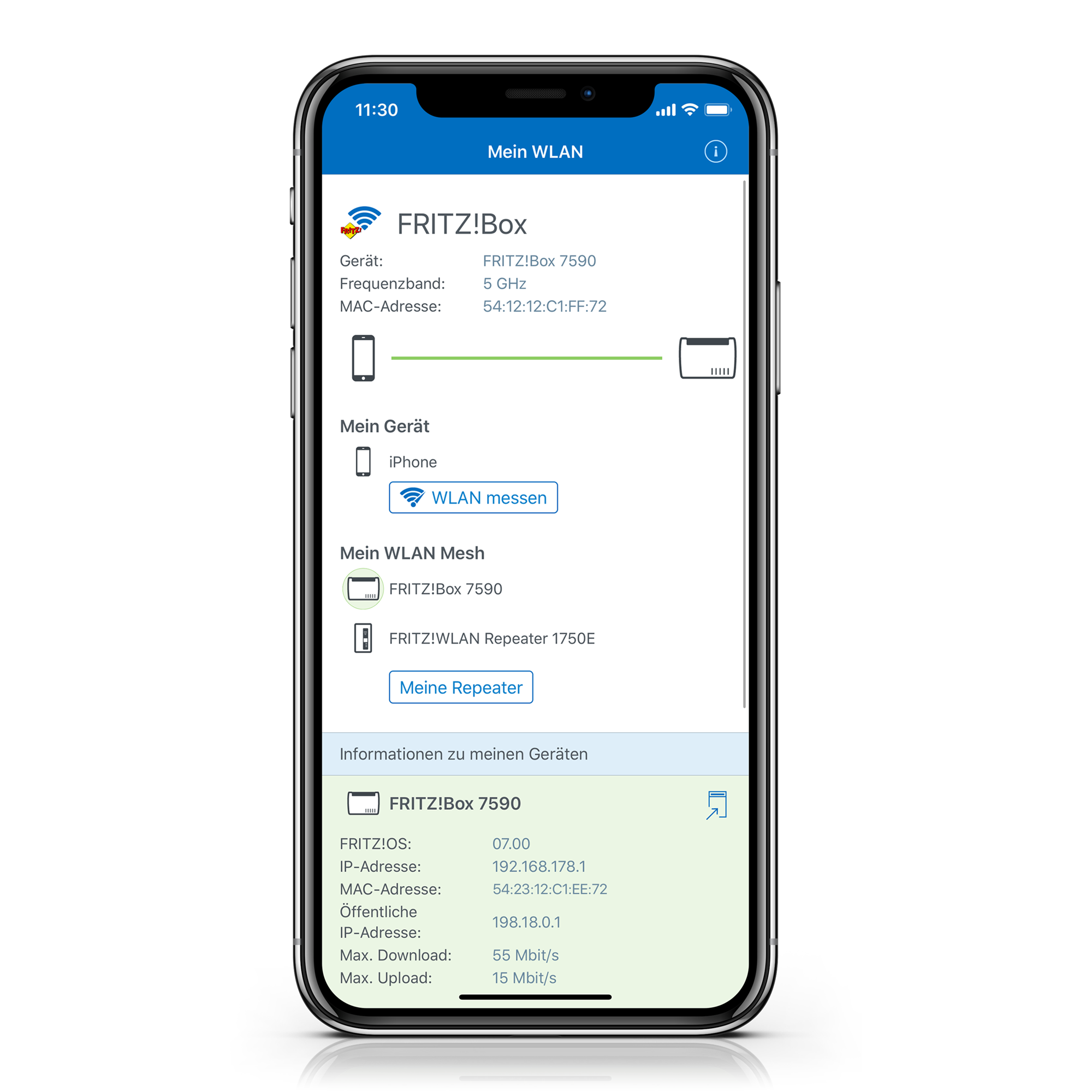 Die FRITZ!App WLAN versorgt dich mit den wichtigsten Informationen zu deinem WLAN. Nutze die App, um ganz einfach die Verbindungsgeschwindigkeit deines Smartphones oder Tablets an verschiedenen Standorten im Funknetz zu messen. Zusätzlich hilft die FRITZ!App WLAN beim Finden der idealen Position für deinen Repeater und vereinfacht deinen Gästen den Zugang in dein WLAN-Gastnetz.
