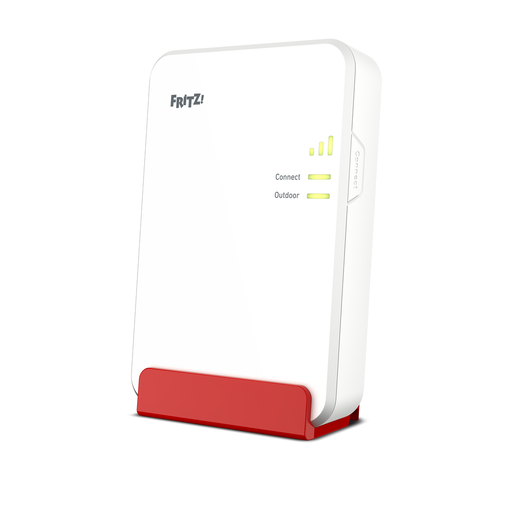 Um die WLAN-Reichweite bis in den Garten zu erhöhen empfiehlt es sich, noch im Haus einen FRITZ!Repeater in unmittelbarer Gartennähe aufzustellen, beispielsweise auf der Fensterbank oder einem Regal neben der Tür zum Garten. Der FRITZ!Repeater 6000 eignet sich zu diesem Zweck besonders gut, da er nicht direkt in die Steckdose gesteckt wird, sondern dank des mitgelieferten Netzkabels relativ frei aufgestellt werden kann.