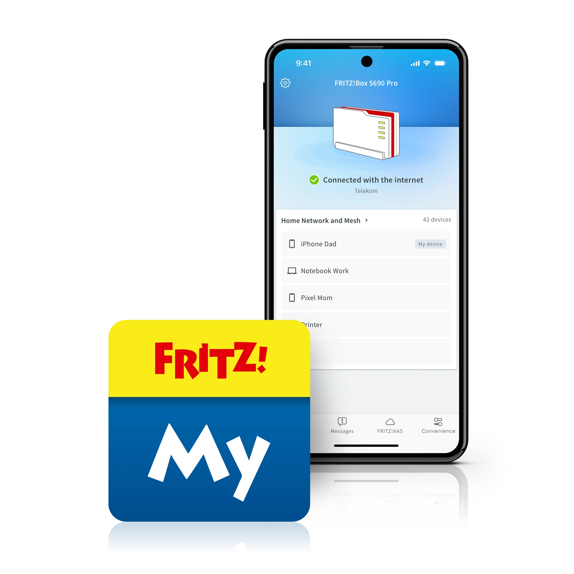 The MyFRITZ!App offers useful features for the everyday use of your FRITZ!Box: Get a quick overview of your home network and access to your FRITZ!Box's convenience functions in the MyFRITZ!App. The app notifies you of missed calls, new voicemail messages and other events in your home network. You can also open the user interface of your FRITZ!Box. The MyFRITZ!App is the easy entry into the FRITZ! world – at home and on the go.