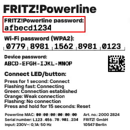 With the FRITZ!Powerline password, you can access the user interface on all of the devices connected with the FRITZ! home network or directly with the FRITZ!Powerline device. Then you can configure settings in the user interface and change the Wi-Fi network key or default password.
