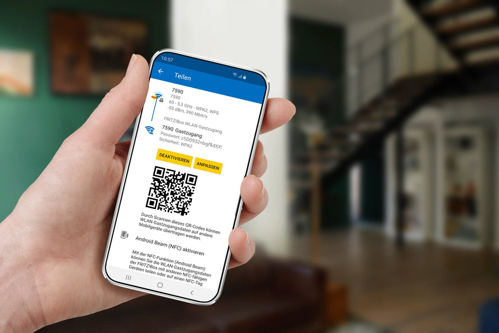 Outre le FRITZ!Fon et l'interrupteur FRITZ!, vous pouvez aussi afficher très facilement le QR code via nos applis FRITZ!App Wi-Fi et MyFRITZ!App et demander à vos invités de les scanner.