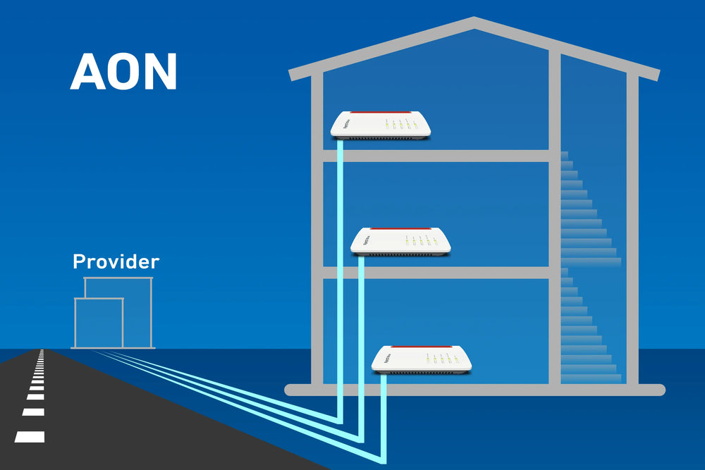 AON is opgebouwd volgens de architectuur ‘point-to-point’. Elke gebruiker heeft een ‘eigen lijn’ met de netwerkprovider – de bekabeling heeft een stervormige topologie. Dat heeft het grote voordeel dat alle eindgebruikers over de volledige bandbreedte beschikken zonder de bandbreedte van andere eindgebruikers te beïnvloeden. Het netwerk wordt aangeduid als ‘actief’, omdat vanuit de aansluiting gezien het eerst volgende netwerkelement een ‘actief’ element is: namelijk de switch aan de kant van de aanbieder, waar de glasvezel wordt getermineerd.