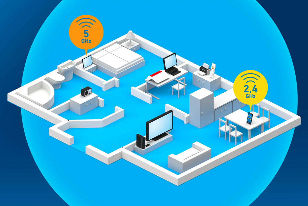 Da es sich bei WLAN um ein Funknetz handelt, müssen die Funksignale in einem bestimmten Netz bzw. Frequenzbereich übertragen werden. Der langjährige Standard ist das 2,4-GHz-Netz. Das bedeutet, dass alle WLAN-Geräte im Heimnetz auf dieser Frequenz funken, was bei einer großen Menge an Hardware nicht nur zu großer Auslastung, sondern ggf. auch zu einer Beeinträchtigung der Geräte untereinander führt. Neben dem 2,4-GHz-Band kann auch das deutlich störungsärmere 5-GHz-Band für WLAN benutzt werden.