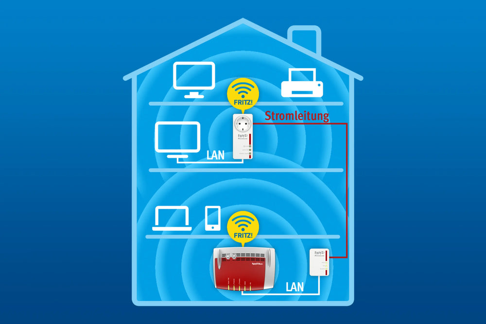 Mit der Powerline-Technologie (auch PowerLAN, dLAN oder Powerline Communication/PLC genannt) überträgst du deine Daten ergänzt durch Netzwerkkabel oder WLAN-Funk über die Stromleitung deiner Wohnung.