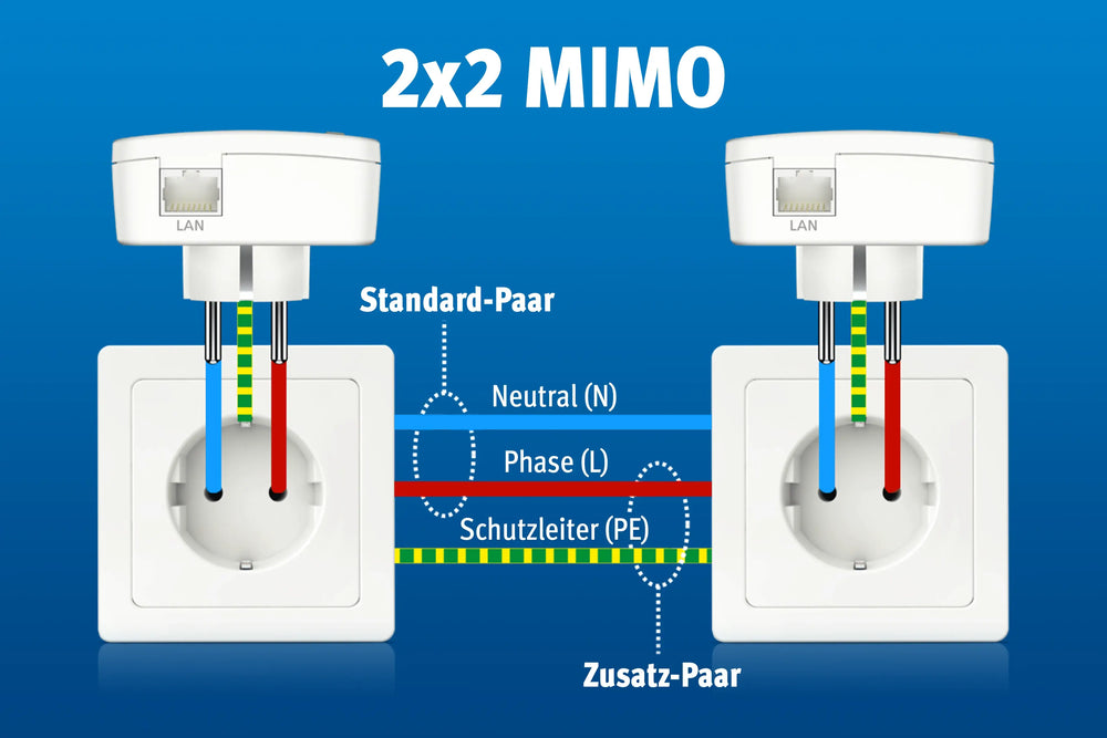 Moderne Stromkreise haben drei Adern – L: die Phase, N: den Neutral-Leiter und PE: den Schutzleiter. Bei älteren Leitungen sind es nur zwei Adern. Wer Powerline-Produkte mit dem schnellen Gigabit-Powerline nutzen möchte, benötigt eine Verkabelung mit mindesten drei Adern. Eine Steckdose mit Schutzkontakt und die Verwendung aller drei Adern ist Voraussetzung für die 2x2-MIMO-Funktion, bei der jeweils zwei Sender und Empfänger gleichzeitig Daten austauschen. So werden die derzeit maximal möglichen Datenraten erreicht. Dreiadrige Stromleitungen sowie Steckdosen mit Schutzkontakt sind heute Standard.