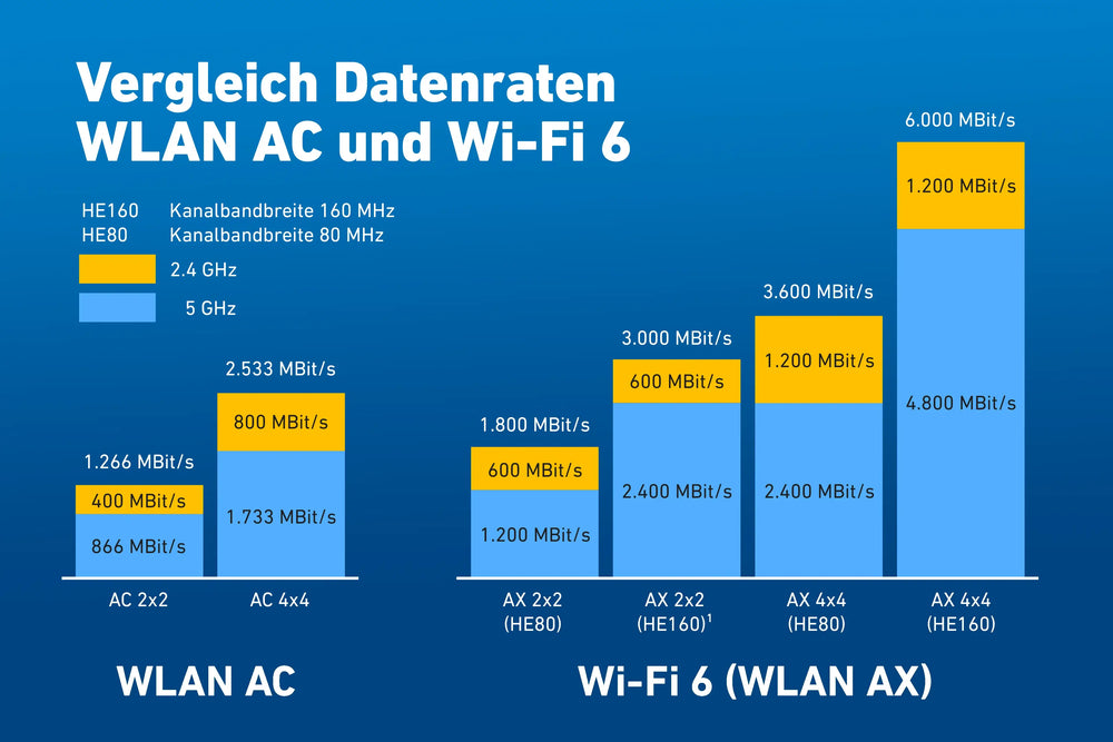 Wi-Fi 6 erhöht aber auch die Geschwindigkeit eines WLANs noch einmal signifikant gegenüber Funkverbindungen mit dem Vorgänger WLAN AC (Wi-Fi 5); in Umgebungen mit besonders hoher Dichte an WLAN-Geräten (z.B. Mehrfamilienhaus) kann der Datendurchsatz um bis zu 40% erhöht werden. Ausschlaggebend dafür ist eine bessere Modulation mit bis zu 1024 QAM (Quadraturamplitudenmodulation).